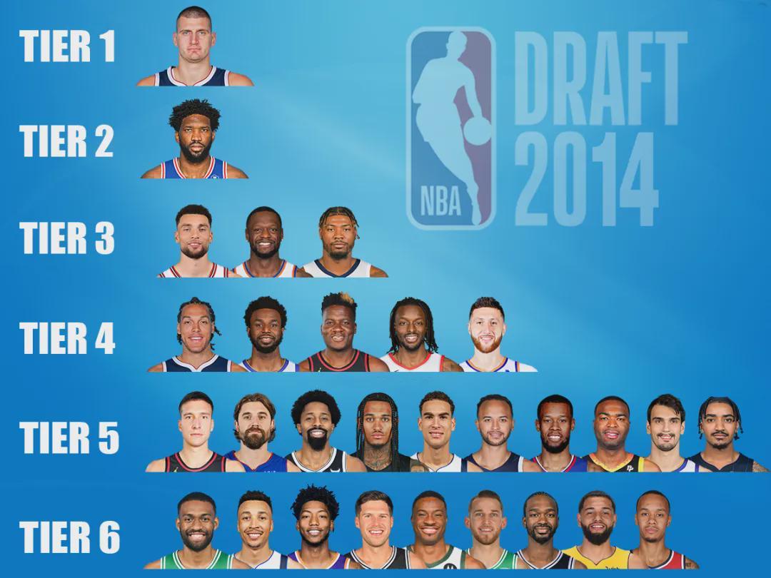 如今回头再看2014届新秀,成就最高的不是状元维金斯,也不是榜眼贾巴里-帕克或者探花恩比德,而是第41顺位的约基奇。约老师手握3个常规赛MVP,以及一个总冠军和一个FMVP。重排2014届新秀的话,约老师独占第一档,帕克在第六档。