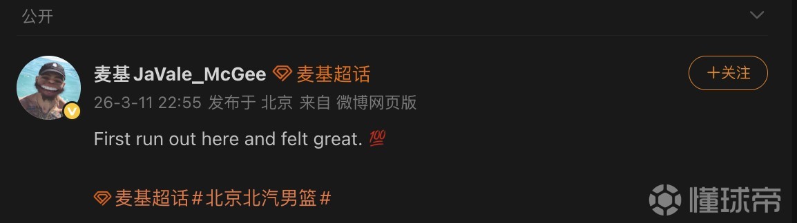 麦基在个人社交媒体写道:“完成CBA首秀,感觉相当不错!100分。”