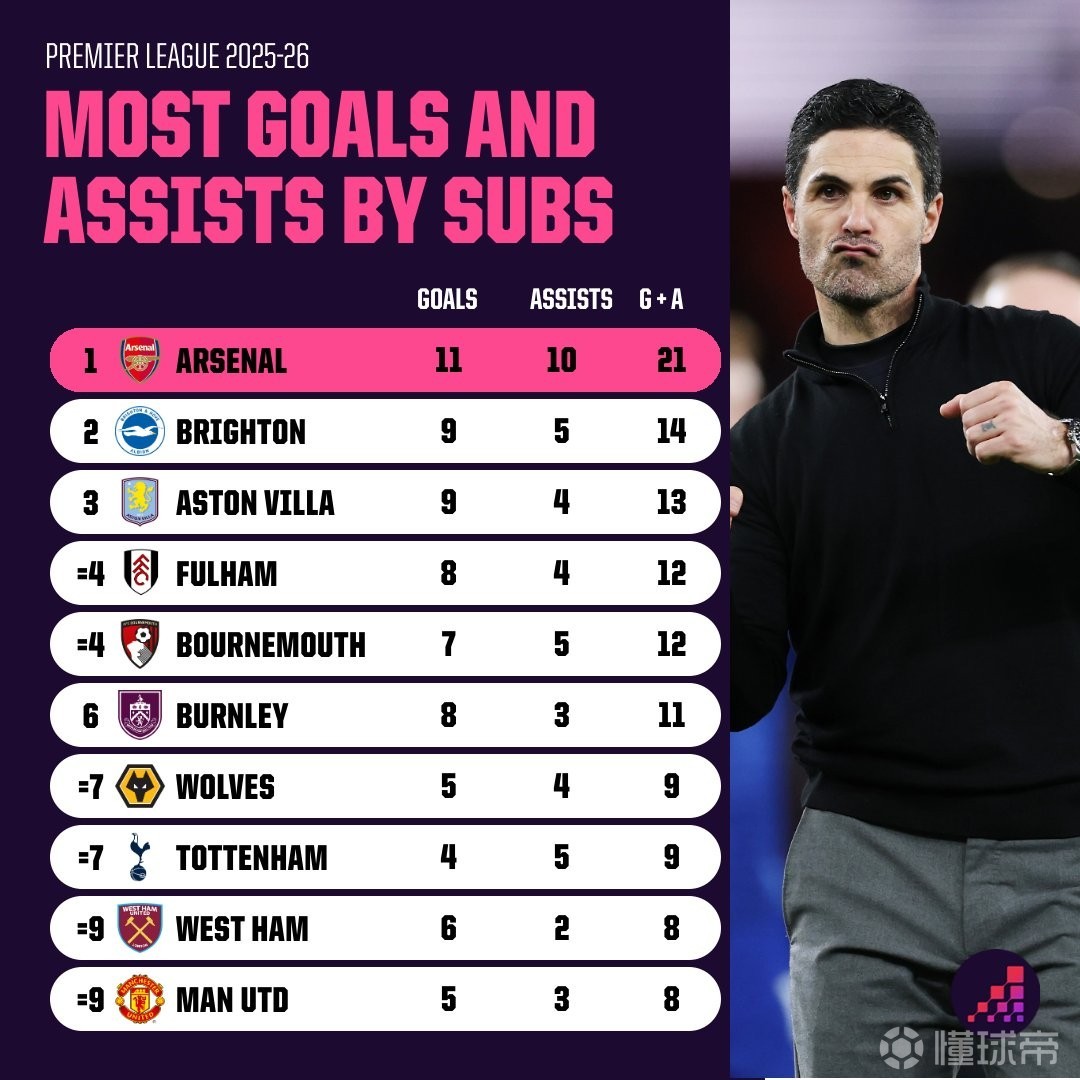 Opta列出了本赛季英超球队替补球员参与进球榜,阿森纳以21球居首,领先第二名的布莱顿7球,曼城以2球垫底。